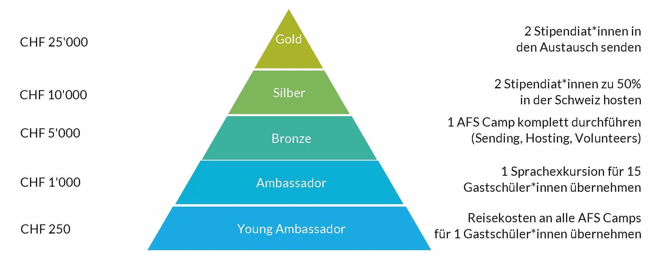 Hosting Stipendien: ermöglichen benachteiligten Jugendlichen aus dem Ausland, in die Schweiz zu kommen und unterstützen sie bei zusätzlichen Kosten wie Verpflegung in der Schule, Reisen zu AFS-Camps, Besuch von AFS-Veranstaltungen.